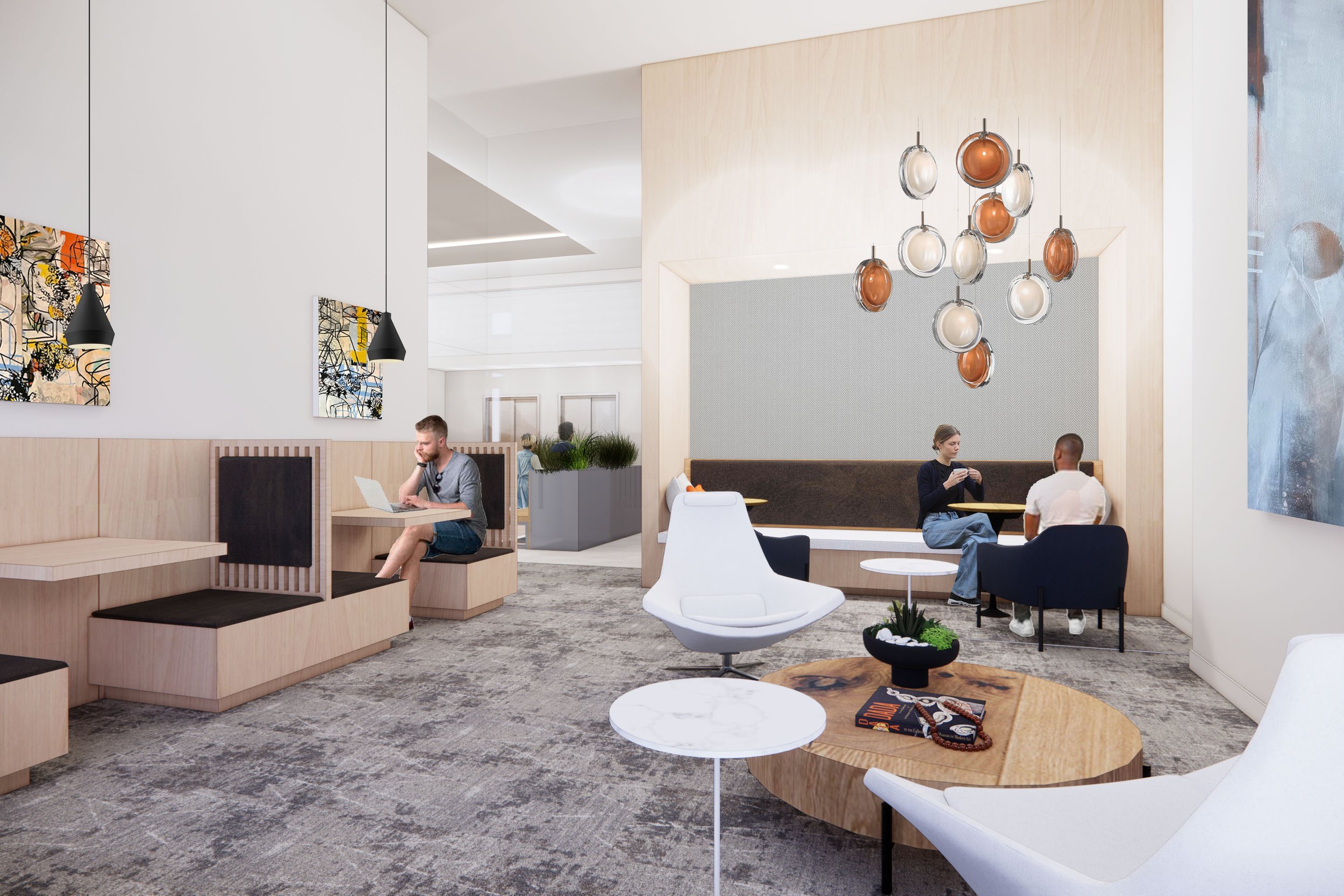 Upon entering the building, residents and guests are greeted by a spacious, art gallery-like lobby. The amenity spaces are inspired by colors, materials and inspirations of the local art scene. The Coworking suite is flooded with an abundance of natural light and offers a direct visual connection to the street. The more intimately scaled spaces of the conference room and study nooks are animated through pops of color and texture. The art-infused character and layout of the Amenity Lounge is defined by a series of built-in seating nooks clad in richly colored wood. A monumental fireplace focal wall anchors the space.